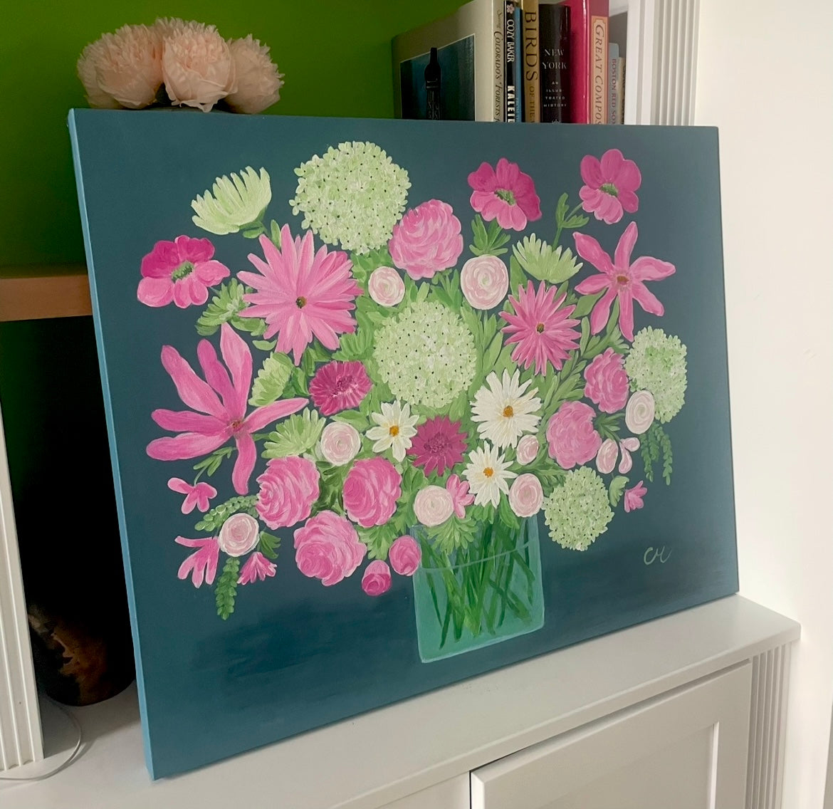 "MAISON DES FLEURS", is an acrylic painting on a 24"x30"x1.5"(d) stretched canvas and it will arrive ready to hand. The sides are painted as well.