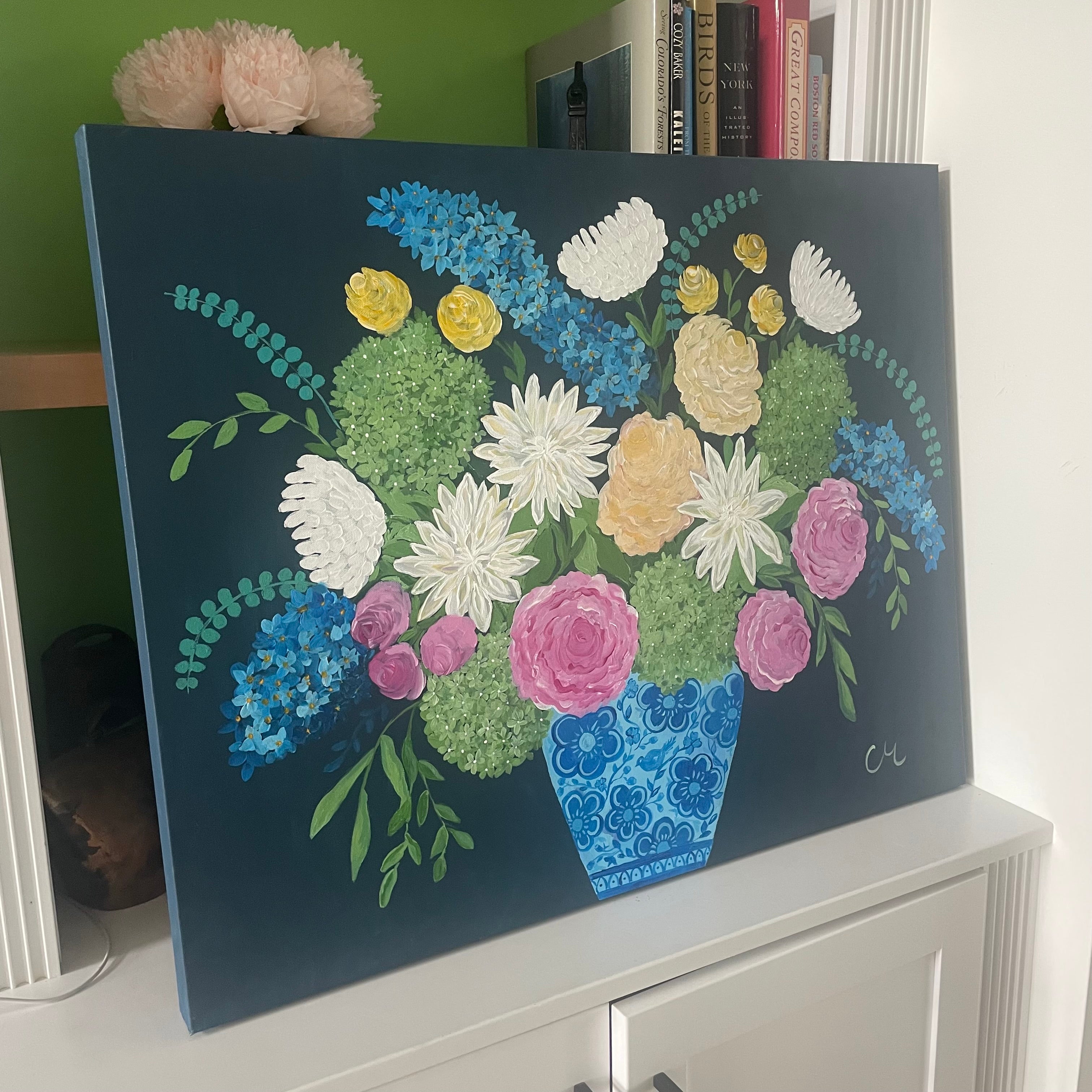 "MOONLIGHT BLOOMS", is an acrylic painting on a 24"x30"x1.5"(d) stretched canvas and it will arrive ready to hand. The sides are painted as well.