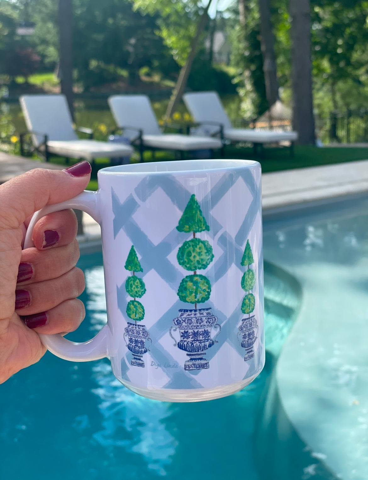 If topiaries are your favorite, then this print is for you!  This pretty classic design helps us make our morning a little bit more cheerful and celebrate the beauty of the topiaries and bamboo design style. Same style print design theme on the other side of the mug. This is the perfect gift for anyone anytime, friends, colleagues, family and teachers.