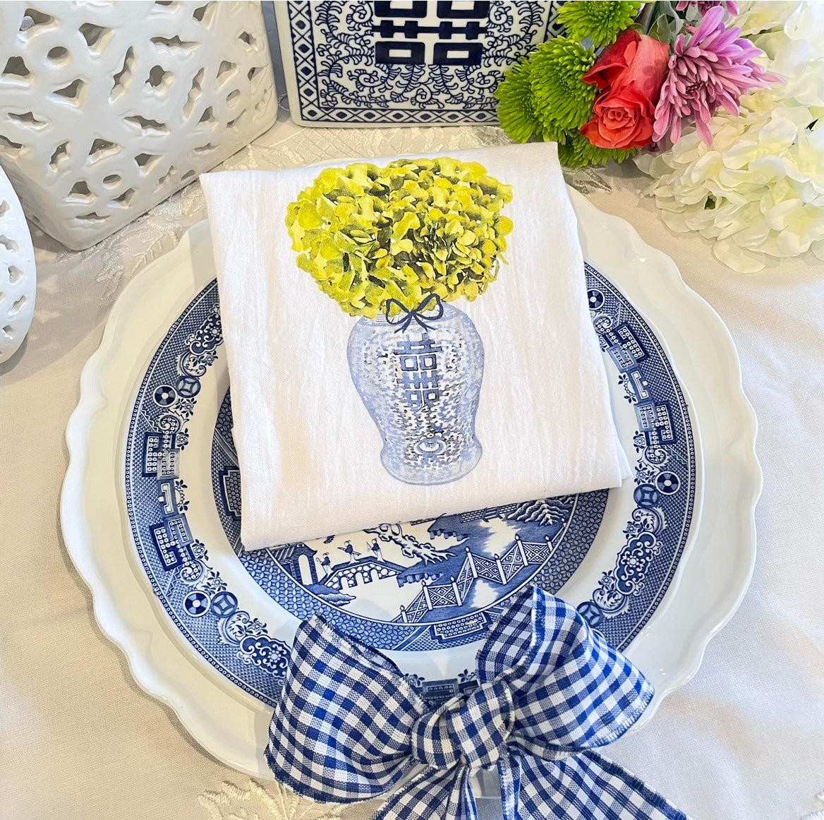Antique Blue and White Ginger Jar with Green Hydrangeas Flour Sack Towel