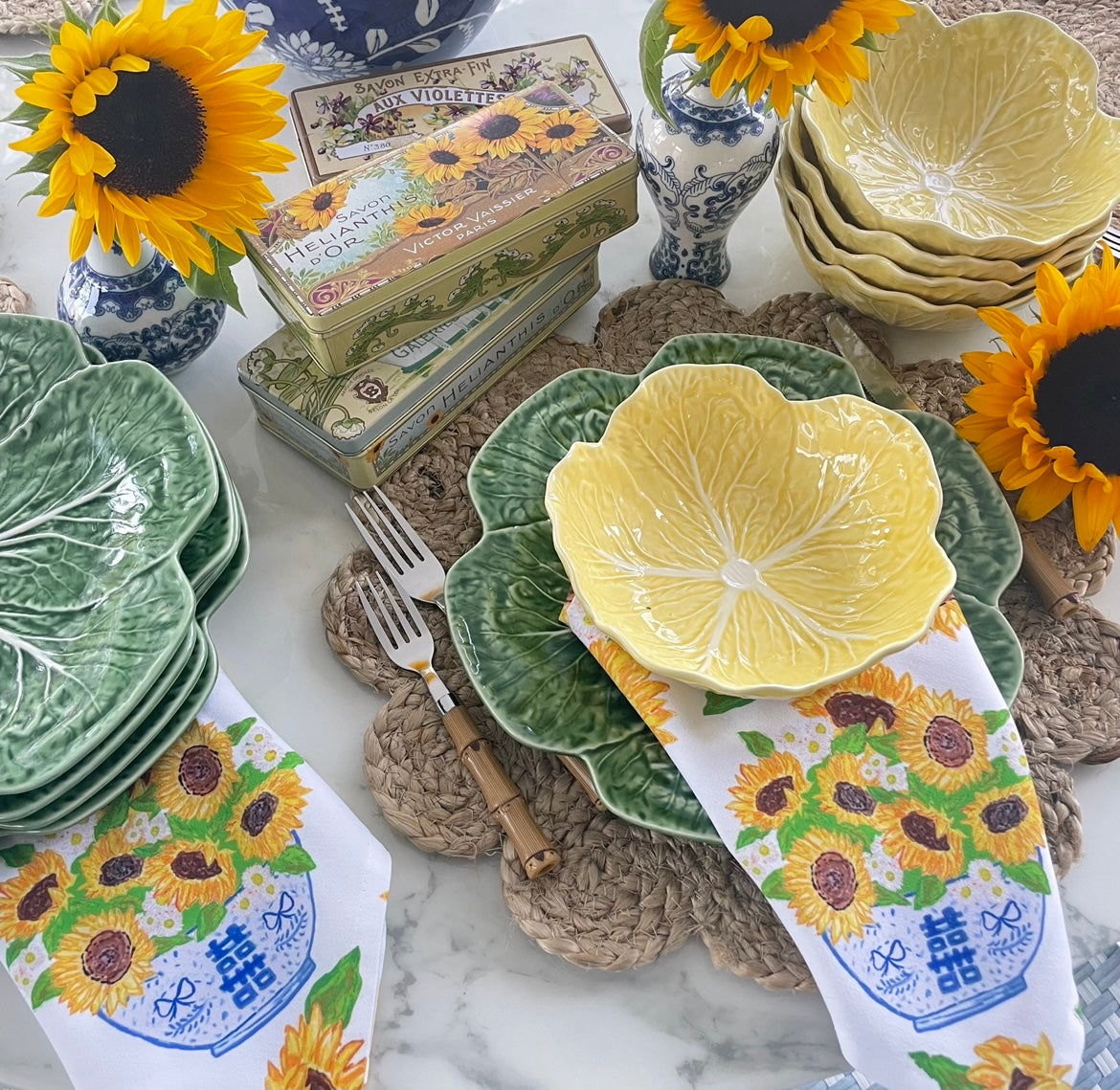 Are you a blue and white lover? Decorate your table with these vintage inspired double happiness bowls with bows filled with sunflowers cloth napkins. You can only find this exclusive design here! These designs and colors reflect the happiness and fun of Ceci's original watercolor and digital illustrations.