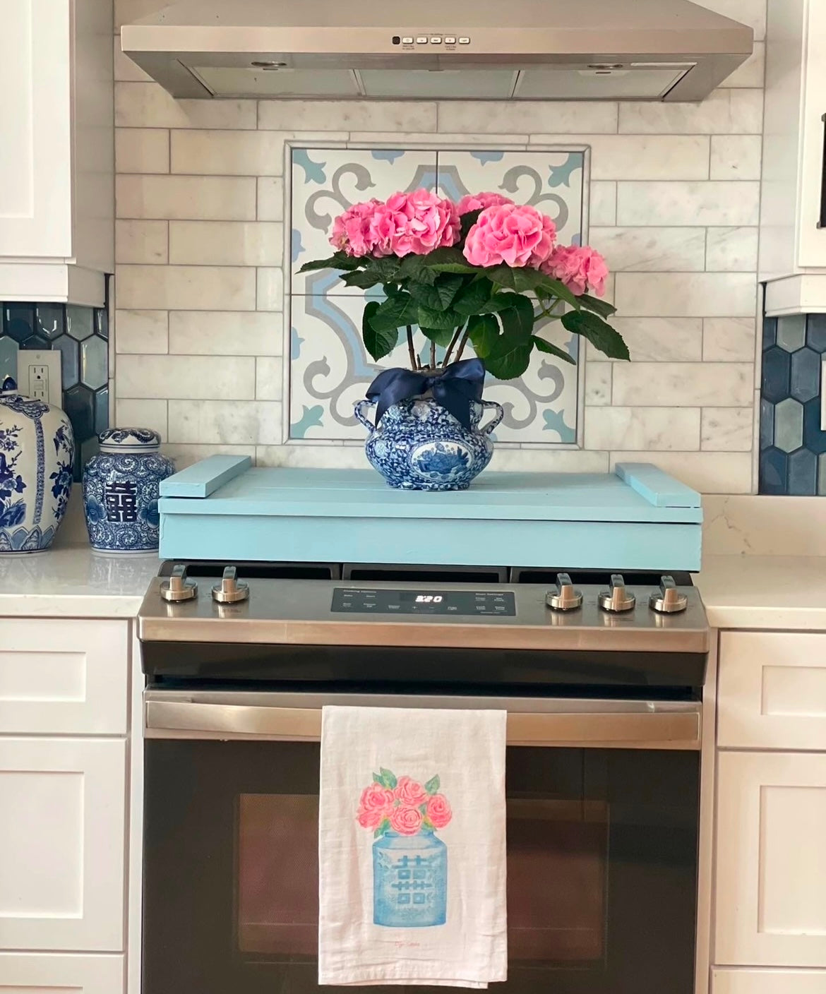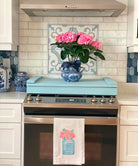 Here is a cheerful touch of chinoiserie chic style for your kitchen or bar cart that will make you smile. The "Happy Roses" with the ginger jar tea towel will brighten any room you decide to place it.