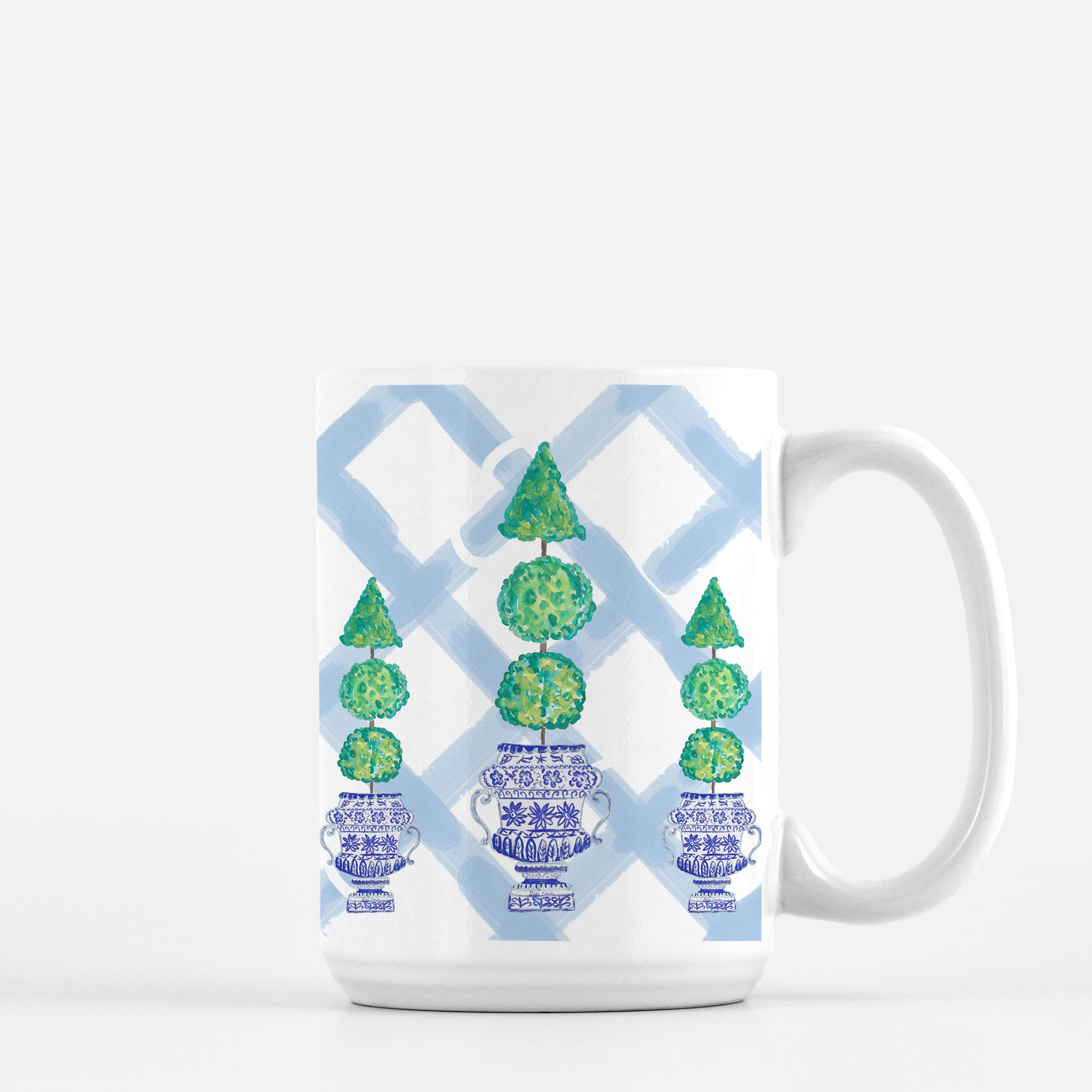 If topiaries are your favorite, then this print is for you! This pretty classic design helps us make our morning a little bit more cheerful and celebrate the beauty of the topiaries and bamboo design style. Same style print design theme on the other side of the mug. This is the perfect gift for anyone anytime, friends, colleagues, family and teachers.