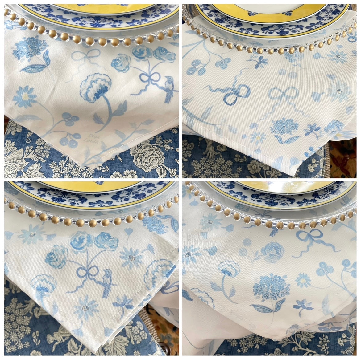 Are you a Grandmillennial Style lover? Decorate your table with these floral, bows and birds cloth napkins. You can only find this exclusive design here! These designs and colors reflect the happiness and fun of Ceci's original watercolor and digital illustrations.