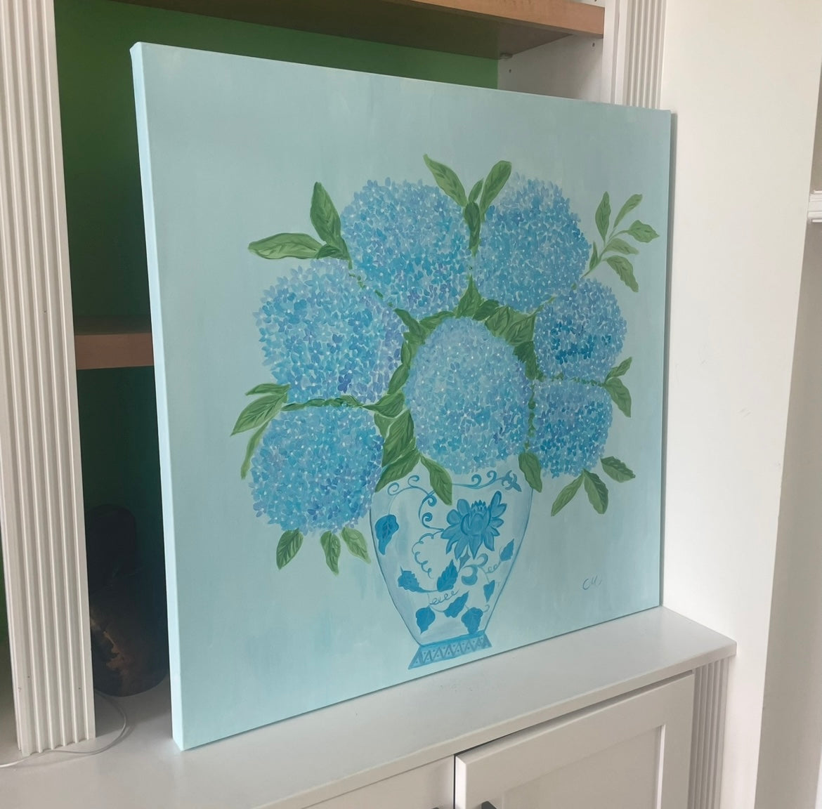 "Jardin Blue" (which means blue garden in French), is an acrylic painting on a 30"x30"x1.5"(d) stretched canvas and it will arrive ready to hand. The sides are painted as well