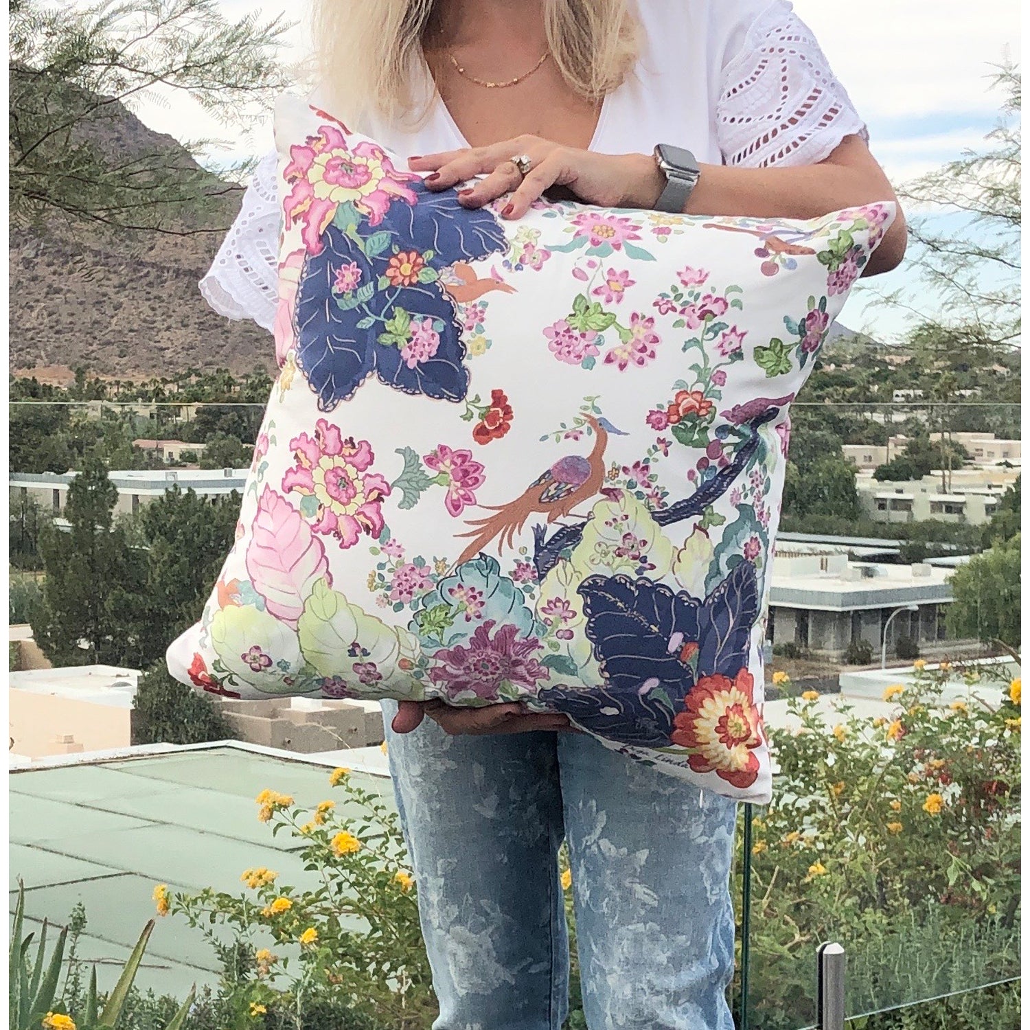 Prints on cotton covers with zippered side to remove insert. Machine wash in cold water using mild detergent and gentle cycle only, hang to dry. Do not bleach. Pillow insert is 100% hypoallergenic polyester fibers.