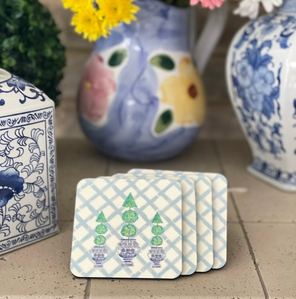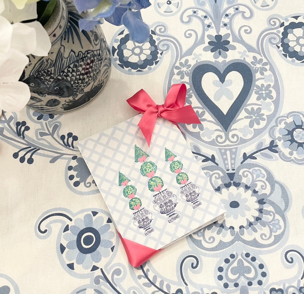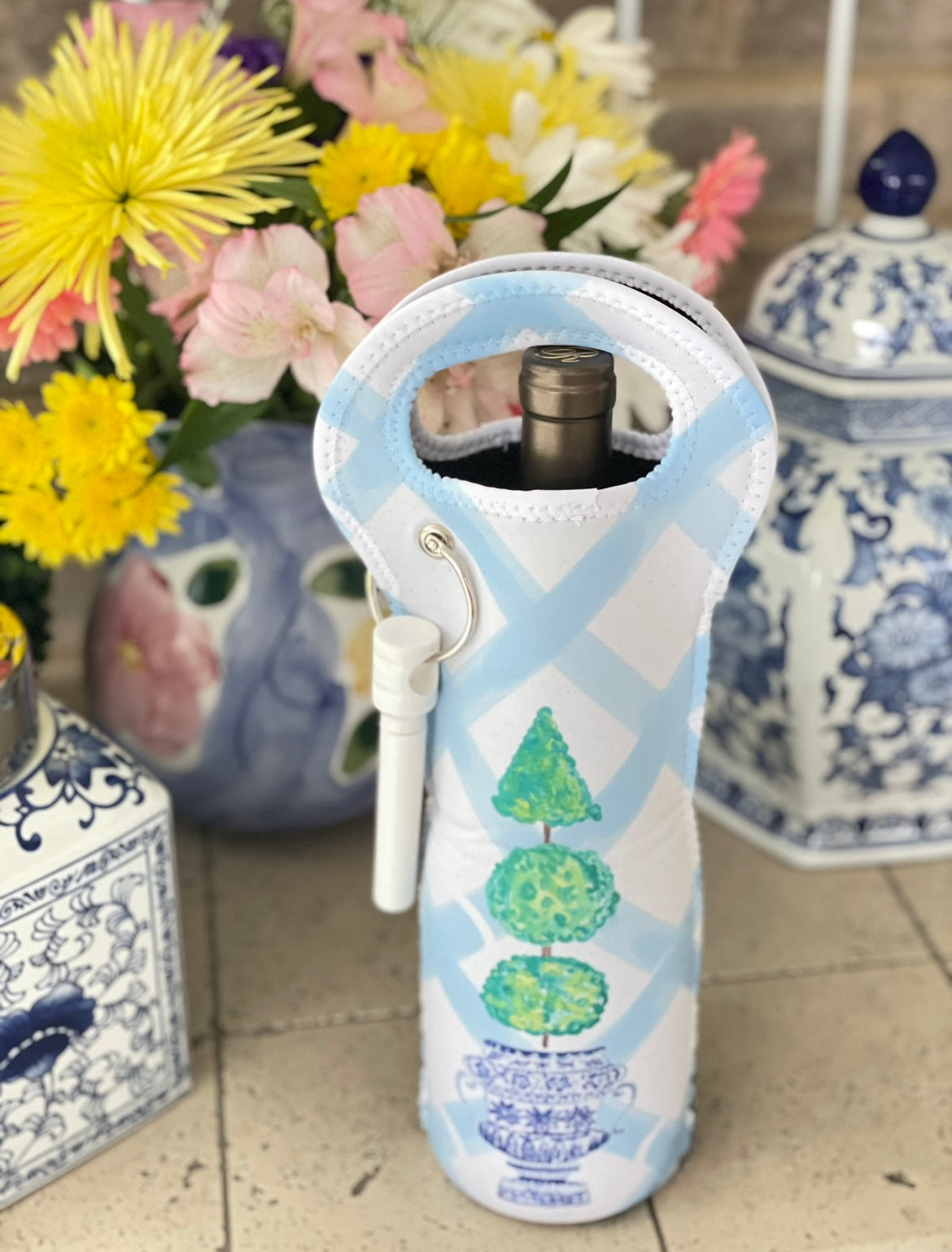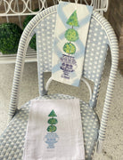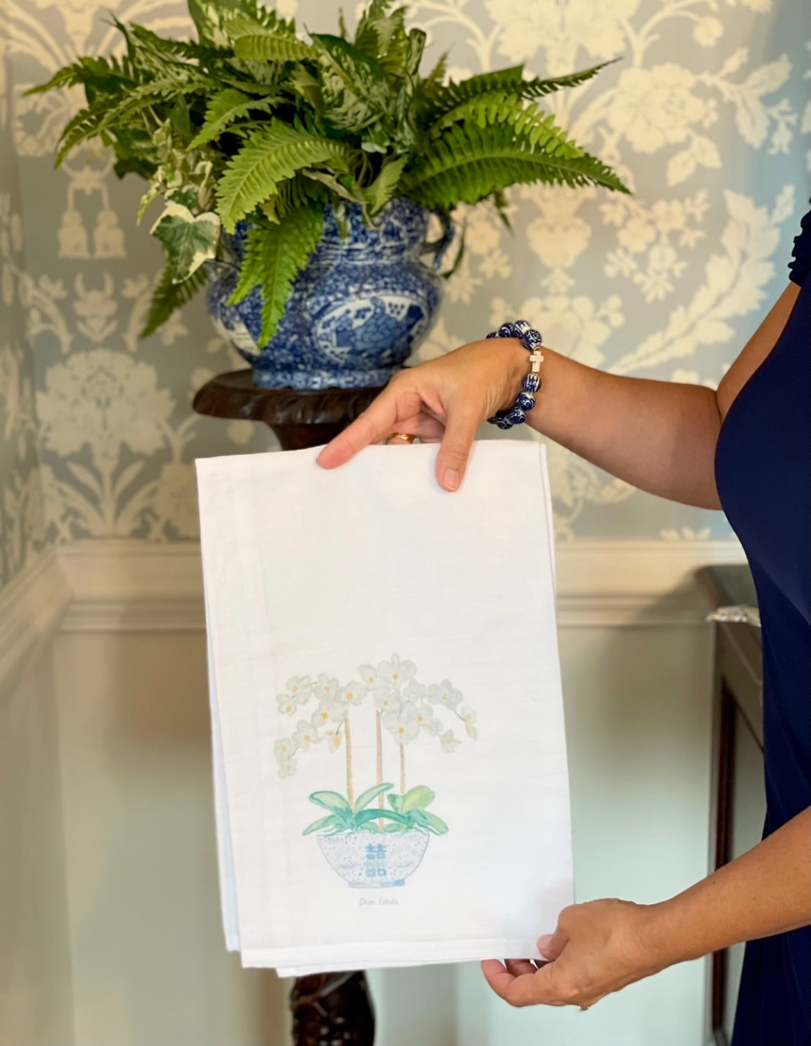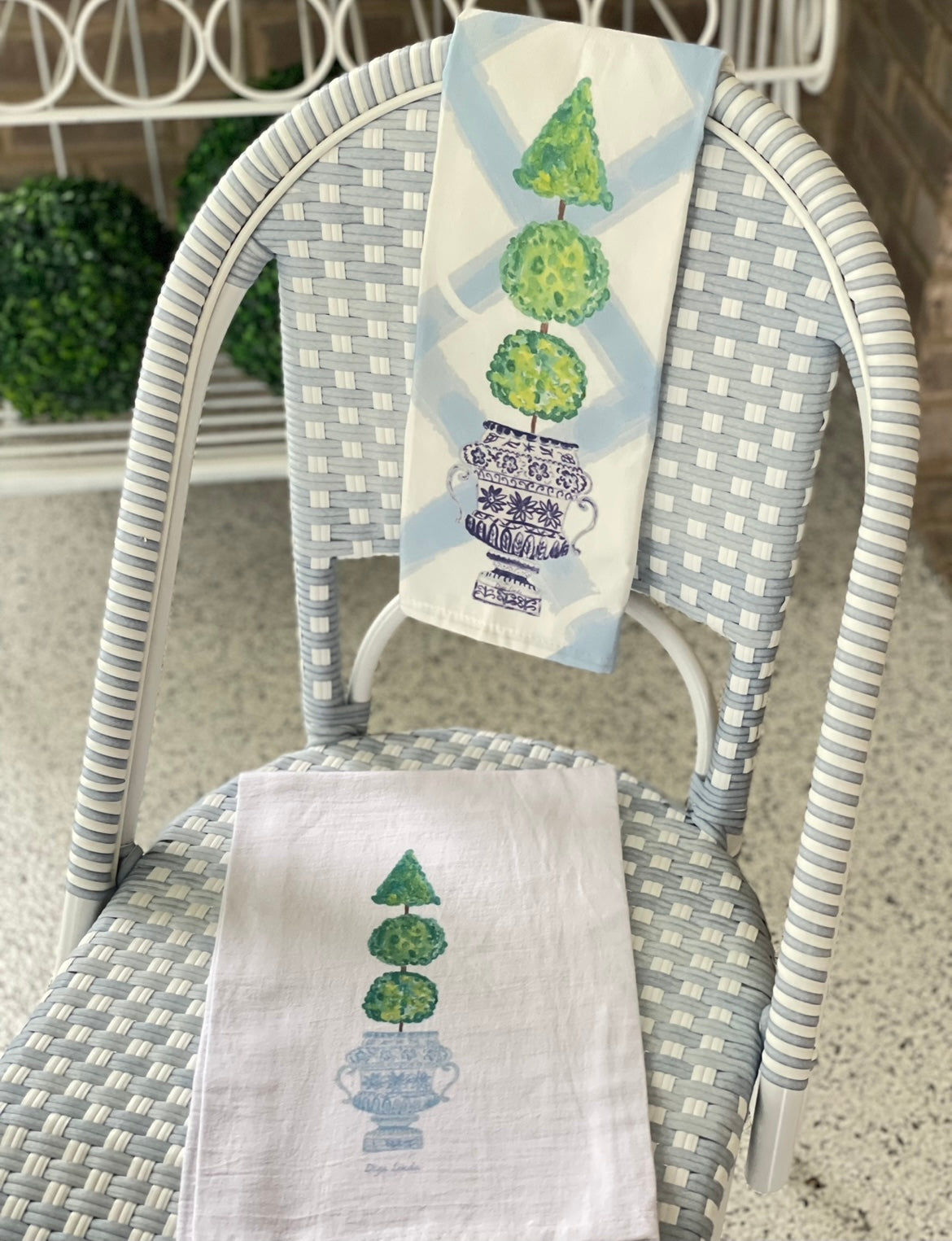Here is a cheerful touch of chinoiserie vintage inspired style for your kitchen or bar cart that will make you smile. Wrap it up around a bottle of wine. The "Topiary" in a the ginger jar tea towel will brighten any room you decide to place it.