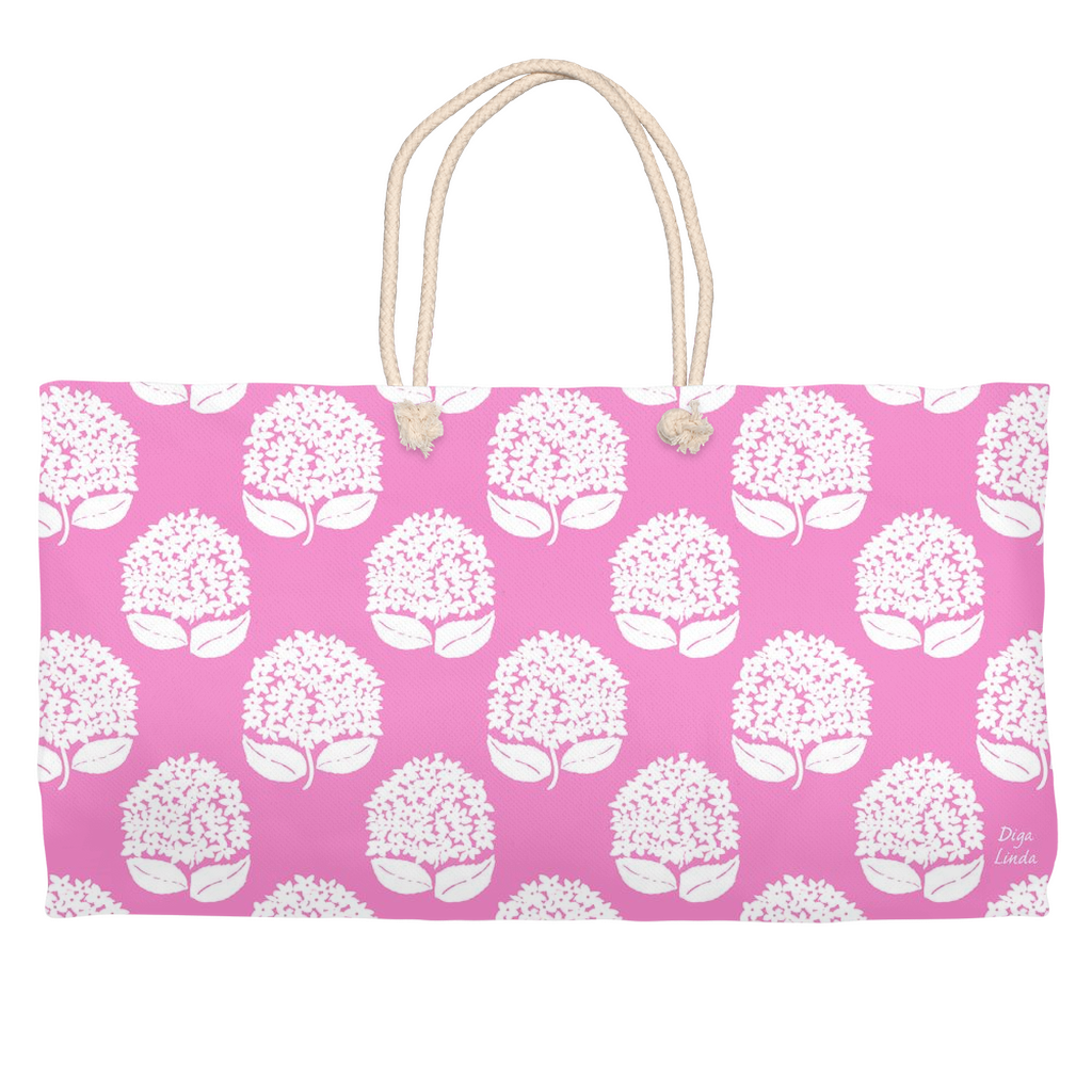 Exclusive weekender tote bag. Use it for a weekend away, for the pool, beach or even groceries!This durable bag has a wide mouth and offers plenty of space for all your personal items.The perfect casual day out accessory, this tote is sturdy, and the white hydrangeas design in the light blue background is elegant timeless and fun.